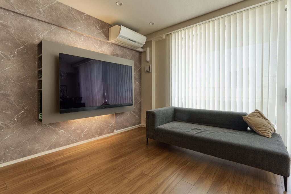 リビングの主役となるテレビ周りは、視線が集まる場所だからこそ、光の演出が際立ちます。